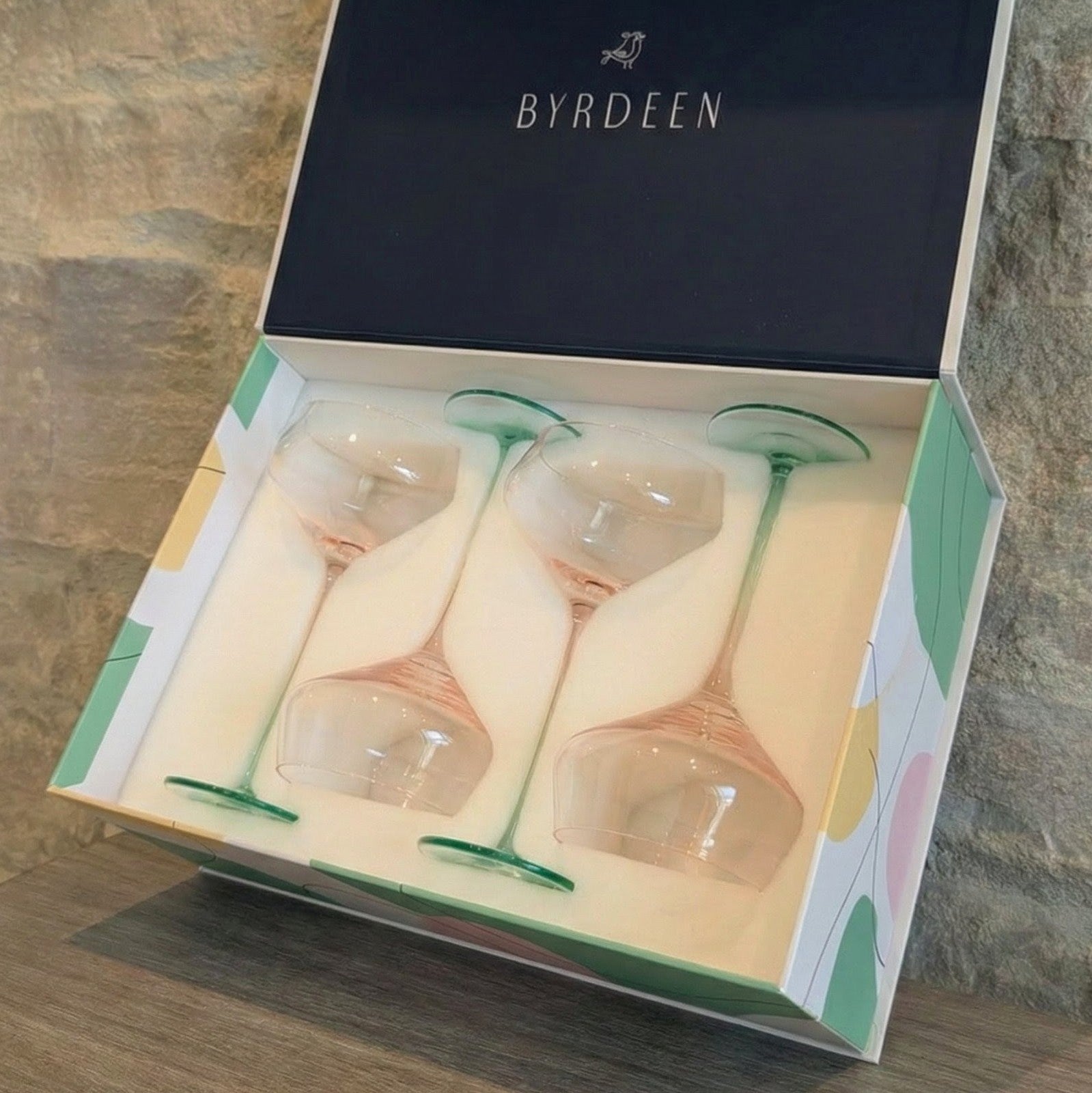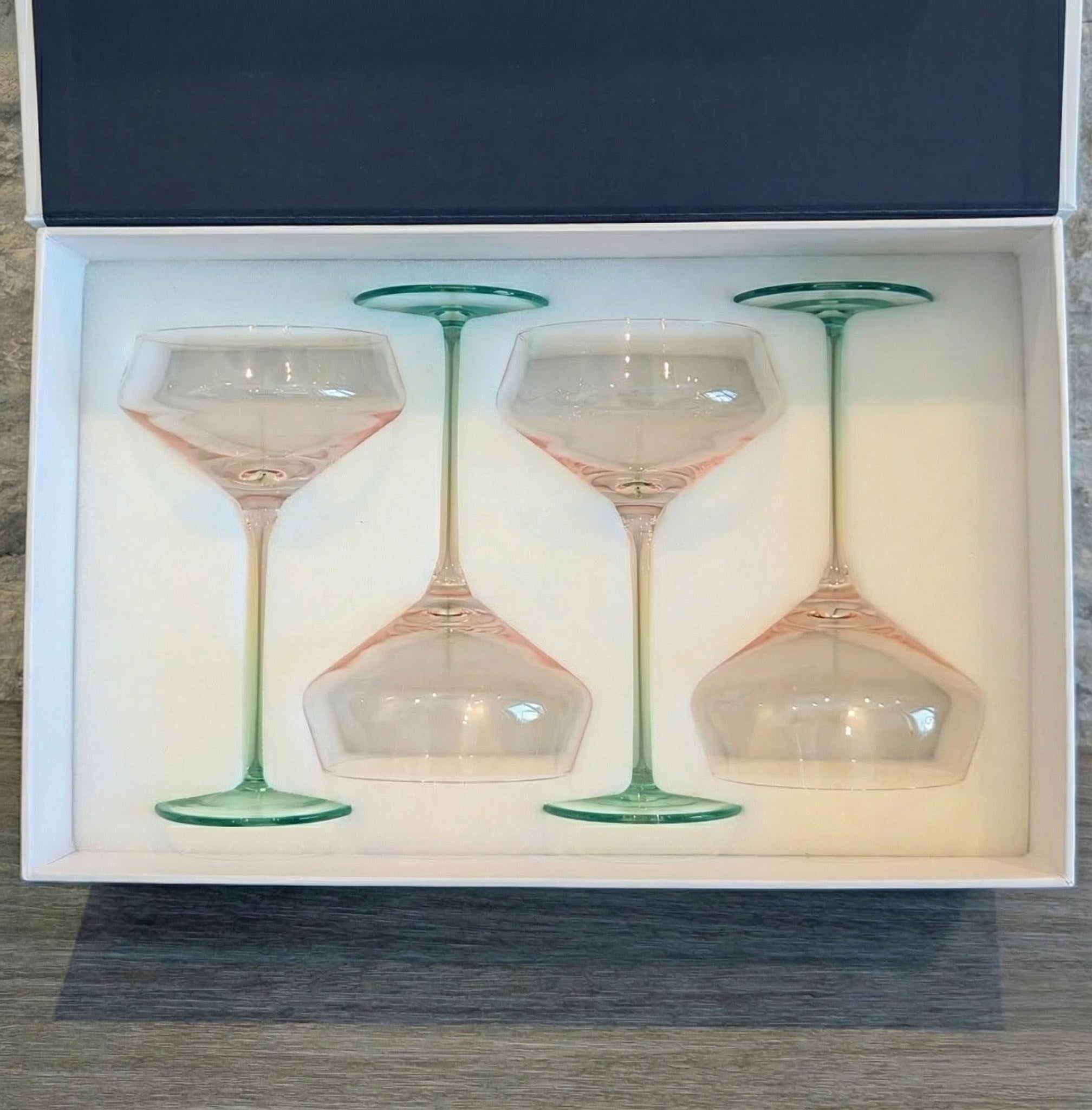Quetzal. It’s kind of a funky word. But if you’ve ever seen a Quetzal byrd in Costa Rica, you will understand why these colors landed in our collection. Talk about gorgeous! We are thrilled to be the coupe glasses designed with the Quetzal in mind, with subtle shades of pinks and greens fluttering throughout. And when you clink us together for a toast, we make a beautiful sound, just like this byrd. That’s due to us being made of crystal. And we’re handmade, so each of us is unique and fabulous.